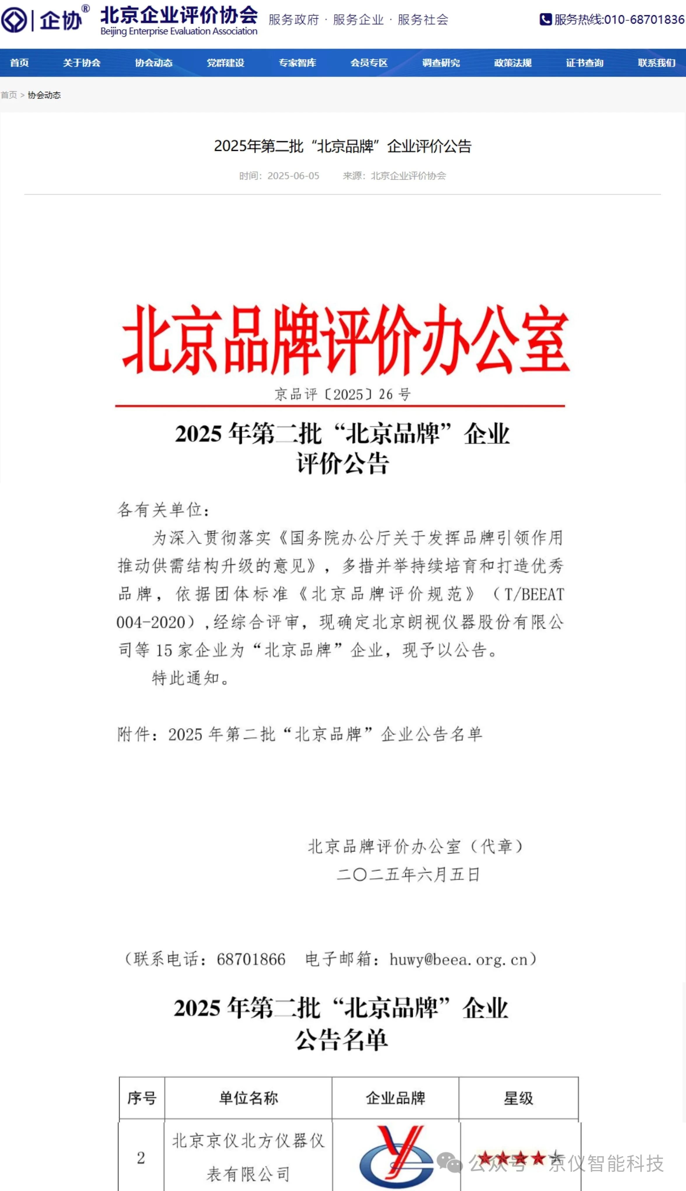 近日,北京品牌評價辦公室正式發布2025年第二批 “北京品牌”企業評價公告,京儀北方公司憑借突出的品牌創新實力和綜合競爭力,成功榮獲“北京品牌”企業四星級稱號。