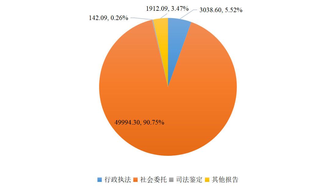 2024年共出具檢驗(yàn)檢測報(bào)告5.51億份,同比下降8.66%,平均每天對社會出具各類報(bào)告150.92萬份。其中,出具行政執(zhí)法類報(bào)告3038.60萬份,占比5.52%,同比下降8.25%;出具社會委托類報(bào)告49994.30萬份,占比90.75%,同比下降7.06%;出具司法鑒定類報(bào)告數(shù)142.09萬份,占比0.26%,同比增長0.76%。
