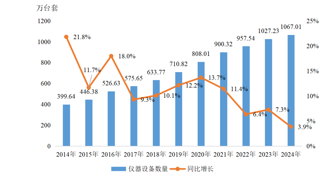 圖1-3 2014-2024年全國檢驗(yàn)檢測機(jī)構(gòu)儀器設(shè)備數(shù)量及增長情況