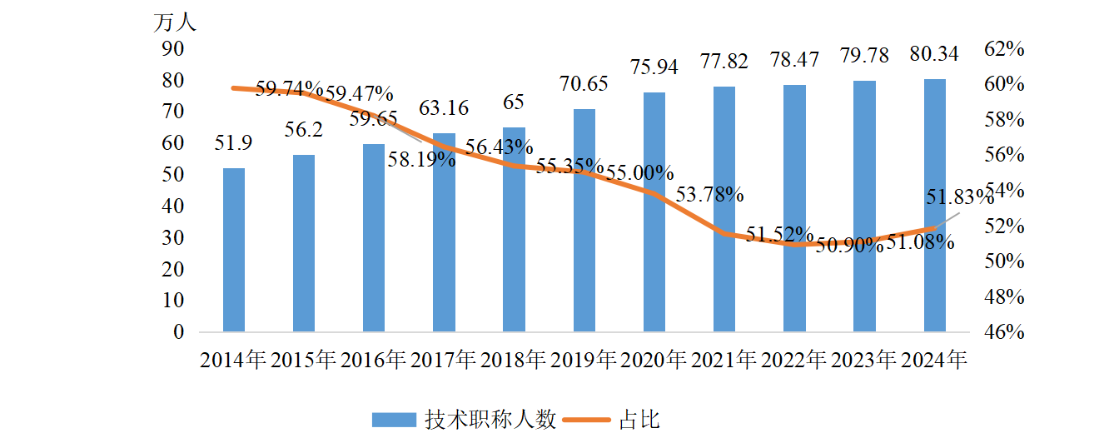 圖1-4 2014-2024年全國檢驗(yàn)檢測機(jī)構(gòu)擁有技術(shù)職稱人員分布情況