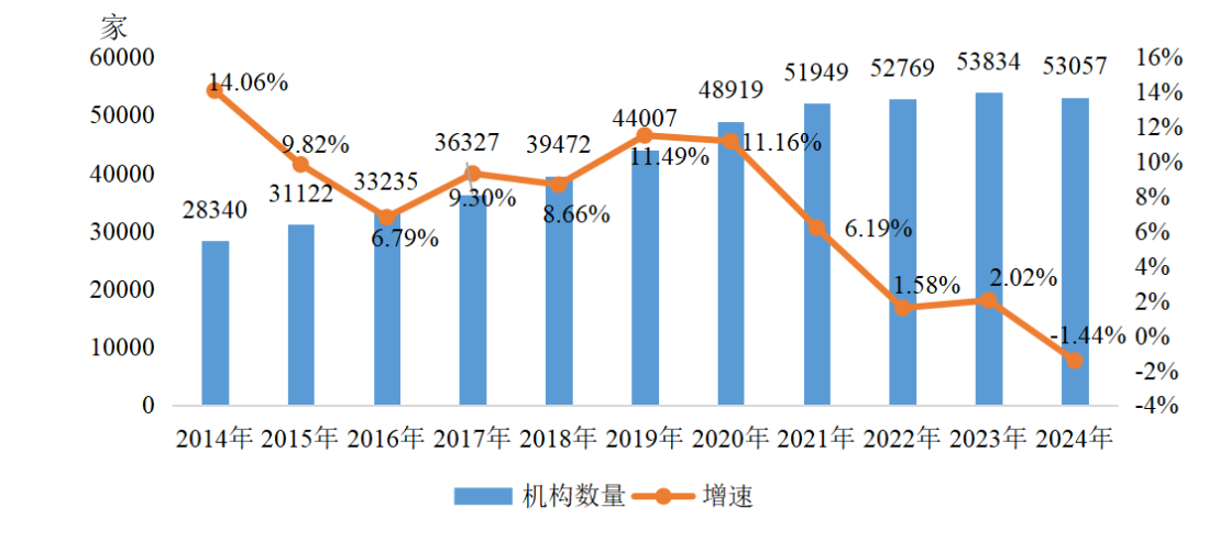 圖2-1 2014-2024年全國檢驗(yàn)檢測機(jī)構(gòu)數(shù)量及增速情況