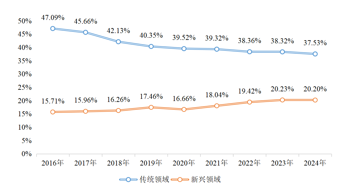 圖2-2 2016-2024年檢驗(yàn)檢測傳統(tǒng)和新興領(lǐng)域占行業(yè)總收入比重情況