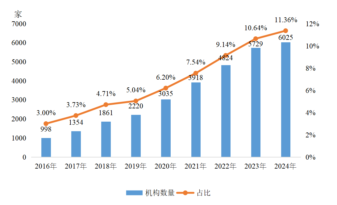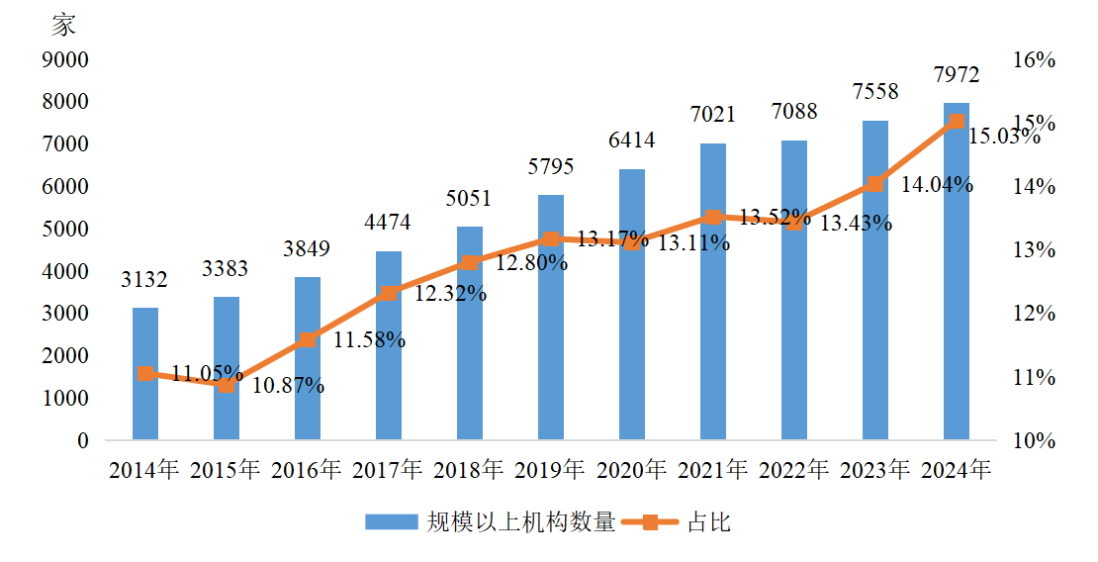 圖3-2 2014-2024年小型和微型檢驗(yàn)檢測機(jī)構(gòu)數(shù)量及占比情況