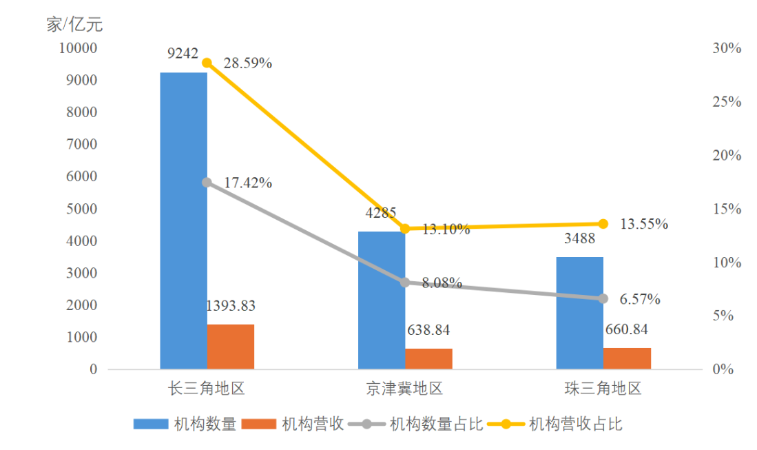 圖4-2 2024年長三角、京津冀和珠三角地區(qū)機(jī)構(gòu)數(shù)量、營收及占比情況