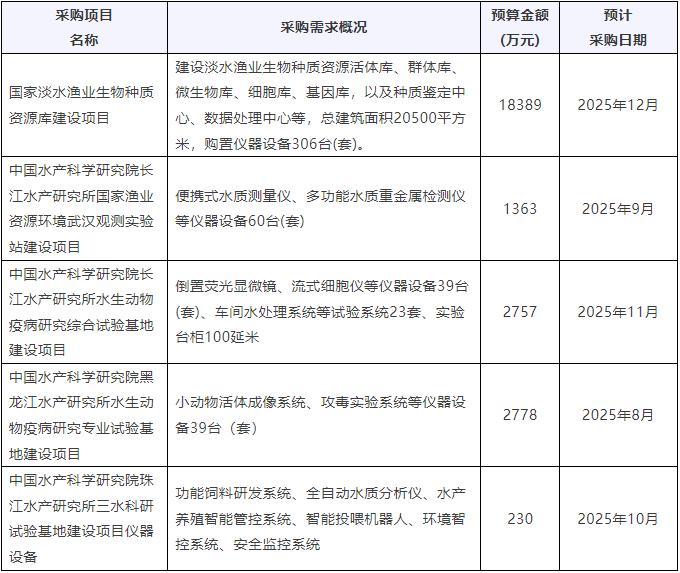 近期,中國水產科學研究院發布多項儀器采購意向,預算總金額25517萬元。涉及儀器設備包括便攜式水質測量儀、多功能水質重金屬檢測儀、倒置熒光顯微鏡、流式細胞儀、小動物活體成像系統、全自動水質分析儀等。預計采購時間2025年8月~12月。