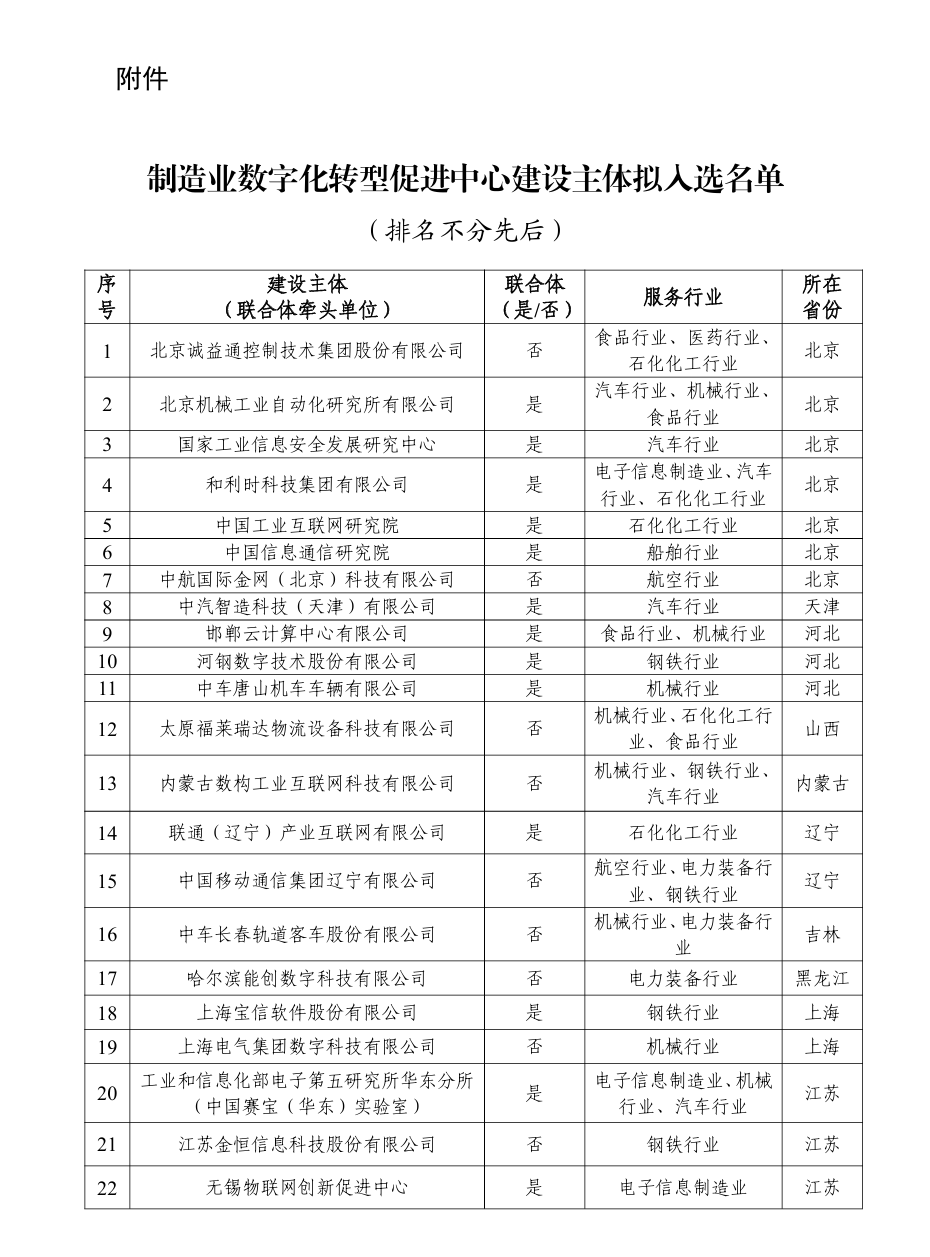 制造業數字化轉型促進中心建設主體擬入選名單公示