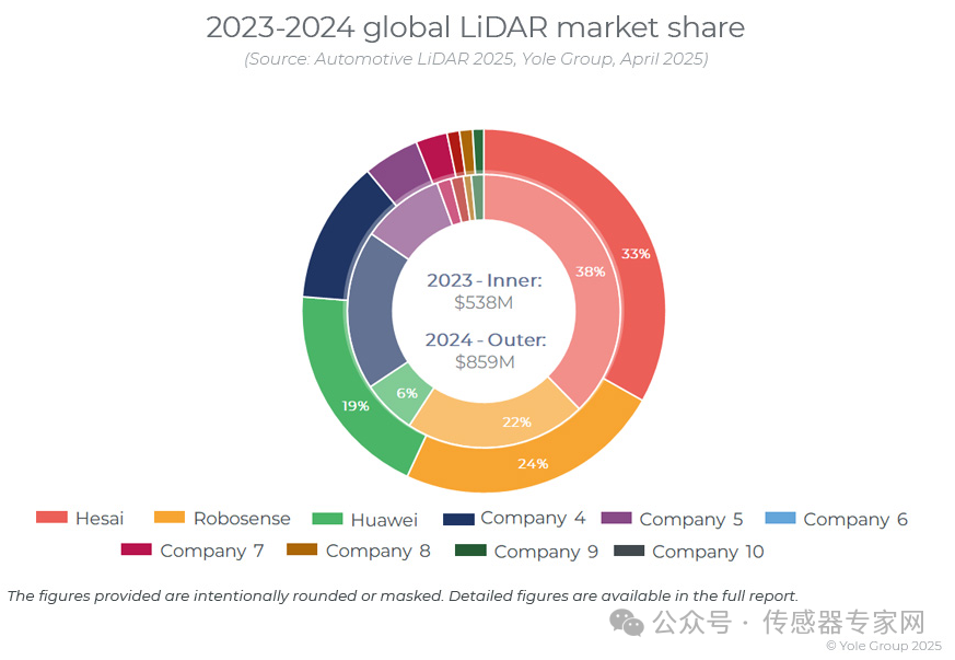 據(jù)今年4月份,咨詢機(jī)構(gòu)Yole Group發(fā)布最新全球激光雷達(dá)產(chǎn)業(yè)報(bào)告《Automotive LiDAR 2025 》(2025車(chē)載激光雷達(dá)報(bào)告)數(shù)據(jù)顯示,中國(guó)激光雷達(dá)廠商禾賽科技占據(jù)33%的市場(chǎng)份額,其次是速騰聚創(chuàng)(24%)、華為(19%)和圖達(dá)通。這四家中國(guó)廠商占據(jù)了88%的市場(chǎng)份額。