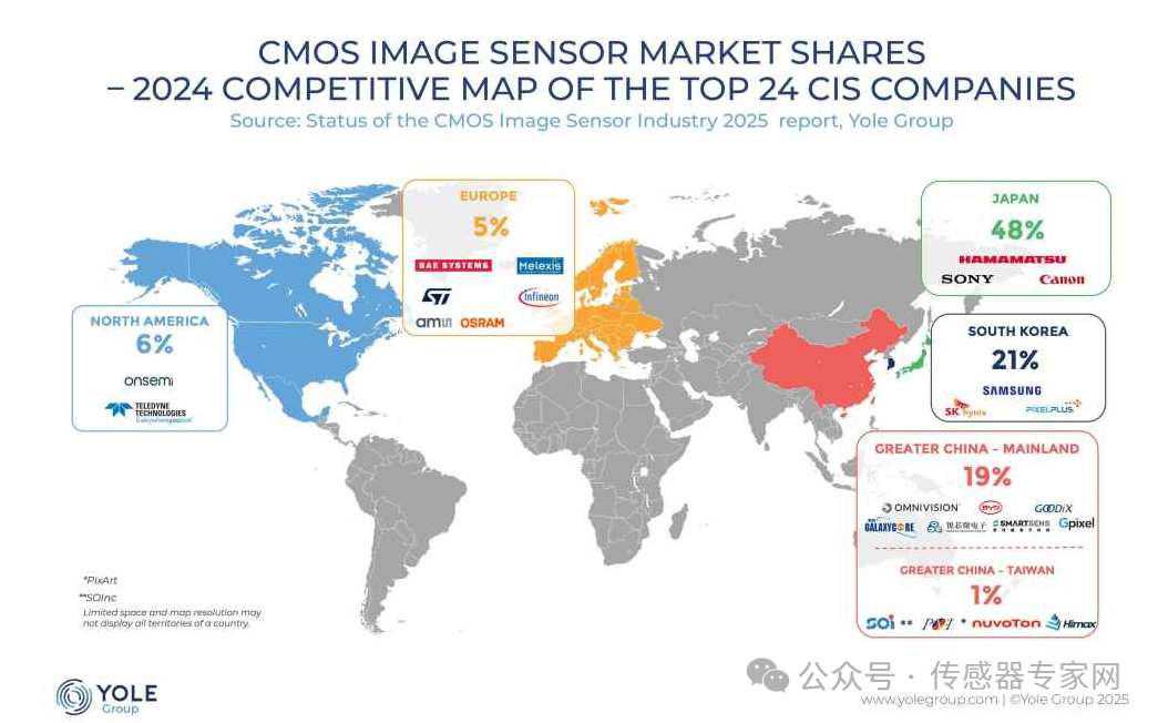 根據(jù)Yole 《Status of the CMOS Image Sensor Industry 2025》(《2025 年 CMOS 圖像傳感器行業(yè)現(xiàn)狀》)報(bào)告顯示,以豪威集團(tuán)(原韋爾股份、Omnivision)、格科微(Galaxycore)、思特威(Smartsens)、比亞迪(BYD)、長(zhǎng)光辰芯(Gpixel)、匯頂科技(Goodix)、銳芯微為代表的中國(guó)大陸CMOS圖像傳感器產(chǎn)生,占據(jù)全球19%的市場(chǎng)份額。此外,中國(guó)臺(tái)灣省的原相科技、晶相科技、敦泰科技等廠商,合計(jì)占1%市場(chǎng)份額。