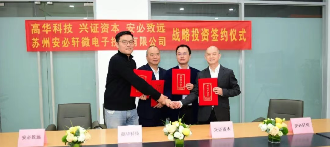10月30日,高華科技參股安必軒戰略投資簽約儀式于蘇州高新區集成電路創新中心成功舉辦。在儀式上,南京高華科技股份有限公司董事長、總經理李維平、興證資本先進制造中心總經理徐長銀、安必致遠總經理曹雪冬與蘇州安必軒微電子技術有限公司董事長蔡激文共同簽署股權投資合作協議,標志著高華科技和安必軒在光電傳感領域的深度合作正式啟動。