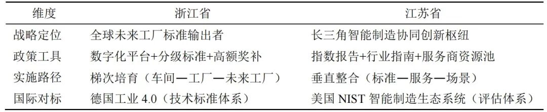 在戰(zhàn)略定位維度:浙江省瞄準(zhǔn)全球未來(lái)工廠標(biāo)準(zhǔn)輸出,依托先進(jìn)實(shí)踐構(gòu)建國(guó)際話(huà)語(yǔ)權(quán);江蘇省聚焦長(zhǎng)三角協(xié)同發(fā)展,整合區(qū)域資源打造智能制造創(chuàng)新樞紐。