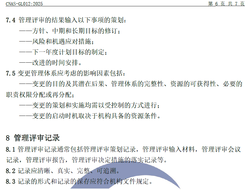 CNAS-GL012:2025 《實(shí)驗(yàn)室和檢驗(yàn)機(jī)構(gòu)管理評(píng)審指南》與CNAS-GL012:2018相比,除結(jié)構(gòu)調(diào)整和編輯性改動(dòng)外,主要技術(shù)變化如下: