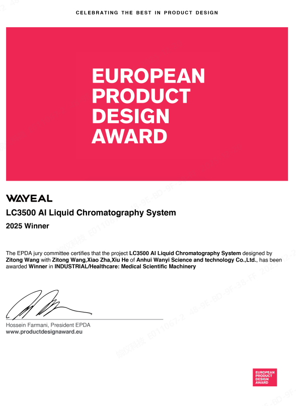 近日,安徽皖儀科技股份有限公司(以下簡稱“皖儀科技”)LC3500液相色譜系統憑借卓越的綜合實力,榮膺2025歐洲產品設計獎(EUROPEAN PRODUCT DESIGN AWARD),成為皖儀科技高端分析儀器在本年度國際獎項征程中的里程碑。該獎項不僅是對產品性能與設計的充分肯定,更代表了歐洲評委對皖儀科技品牌的高度認可,為中國分析儀器拓展全球高端市場注入了強勁動力。