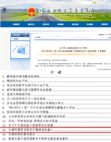 新年伊始,遼寧省工業(yè)和信息化廳正式印發(fā)《遼寧省首臺(套)重大技術(shù)裝備推廣應(yīng)用指導(dǎo)目錄(2025年版)》。我院申報(bào)的《沙漠環(huán)境用光熱定日鏡清洗機(jī)器人》 項(xiàng)目經(jīng)過嚴(yán)格評審,成功獲得“首臺(套)”重大技術(shù)裝備認(rèn)定,并被納入省級推廣應(yīng)用名錄。這是我院在高端裝備研發(fā)與產(chǎn)業(yè)化應(yīng)用領(lǐng)域取得的又一重要突破!