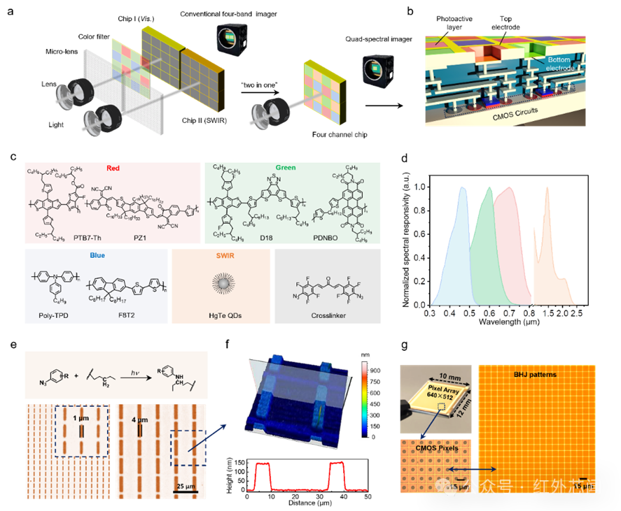 圖1聚焦多通道圖像傳感器的核心設(shè)計(jì)與制備基礎(chǔ),系統(tǒng)呈現(xiàn)集成架構(gòu)、材料選型、圖案化機(jī)理及CMOS兼容特性。對(duì)比采用可見光圖像傳感器+短波紅外圖像傳感器的分離架構(gòu),這項(xiàng)研究聚焦單一集成芯片設(shè)計(jì),將可見光像素與短波紅外像素集成于單芯片,解決了復(fù)雜分光光路設(shè)計(jì)難題,且通過直接光刻圖案化工藝,實(shí)現(xiàn)多波段探測(cè)像素單片集成,解決了可見光與短波紅外像素CMOS工藝的兼容性難題。利用圖案化技術(shù),本體異質(zhì)結(jié)(BHJ)及膠體量子點(diǎn)像素可以與讀出電路(ROIC)單片集成,具有640×512像素陣列,像素間距為15 μm。