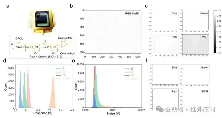 所提出的直接光圖案化方法與標(biāo)準(zhǔn)CMOS制造工藝完全兼容。研究人員將基于聚合物的三色可見光像素與基于碲化汞量子點(diǎn)的短波紅外像素單片集成到同一讀出電路上。這種混合集成策略使得四通道成像器件得以實(shí)現(xiàn),其中可見光和短波紅外像素以2×2陣列排列,每個(gè)子陣列的有效分辨率為320×256。