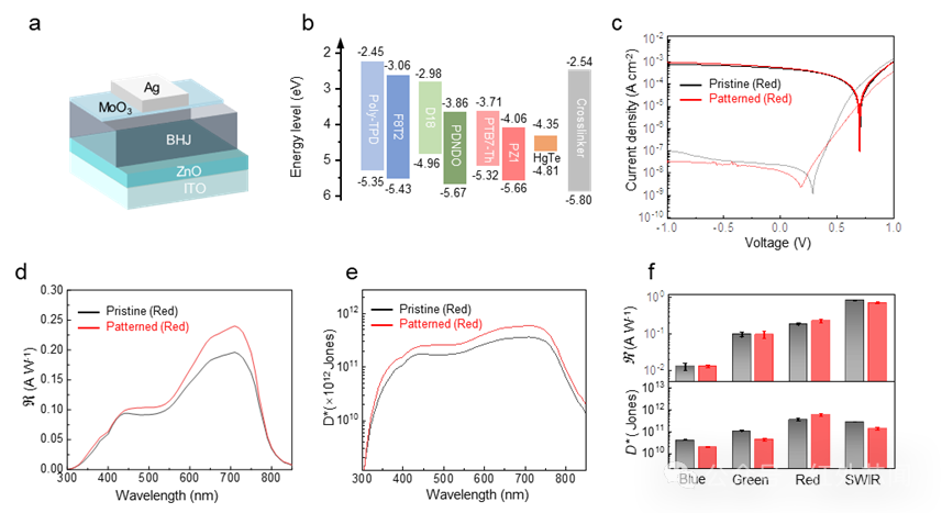 能圖2主要展示圖案化后單元像素器件性能表征。非破壞性圖案化方法對(duì)于保持高性能光電探測(cè)器的光電完整性至關(guān)重要。為了評(píng)估光電二極管架構(gòu)中像素圖案化的兼容性,采用有機(jī)異質(zhì)結(jié)和碲化汞量子點(diǎn)作為活性層,制備了單元器件,并對(duì)圖案化前后的電流曲線、響應(yīng)光譜、比探測(cè)率、響應(yīng)度等關(guān)鍵指標(biāo)進(jìn)行了系統(tǒng)表征。