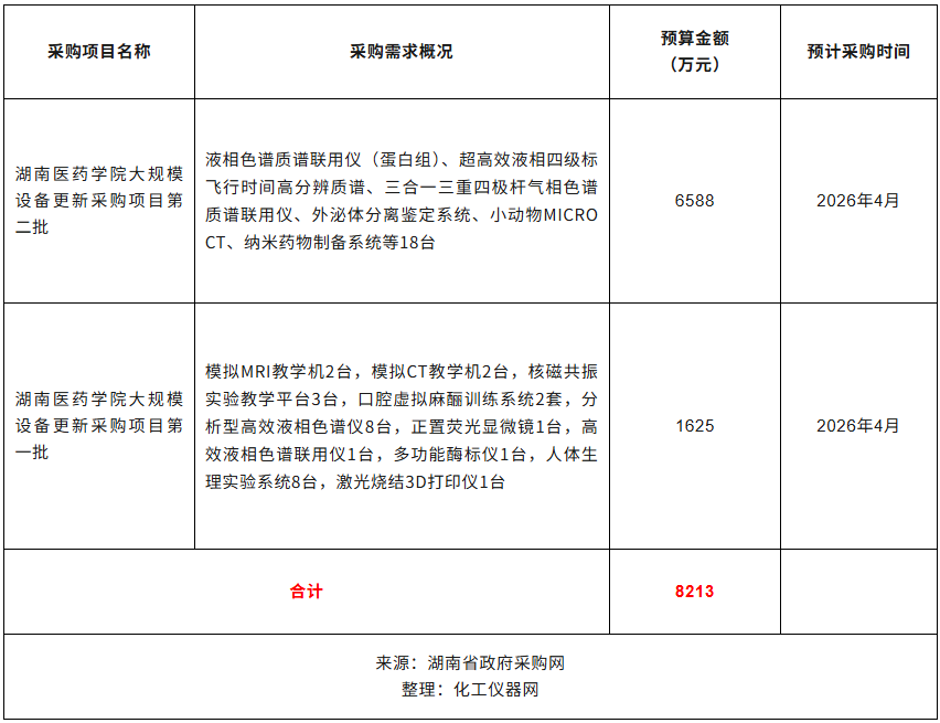 近日,湖南醫(yī)藥學(xué)院公布20262季度采購意向,計劃采購液相色譜質(zhì)譜聯(lián)用儀、外泌體分離鑒定系統(tǒng)、核磁共振實驗教學(xué)平臺、分析型高效液相色譜儀、正置熒光顯微鏡、多功能酶標(biāo)儀等47臺儀器設(shè)備,預(yù)算總金額8213萬元。預(yù)計采購時間20264月。