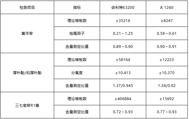 分離效能:依利特E3200 HPLC在黃芩苷、厚樸、三七等多個實際樣品測試中,理論塔板數(shù)顯著高于A1260 HPLC,表明其色譜柱分離效率更為優(yōu)異。