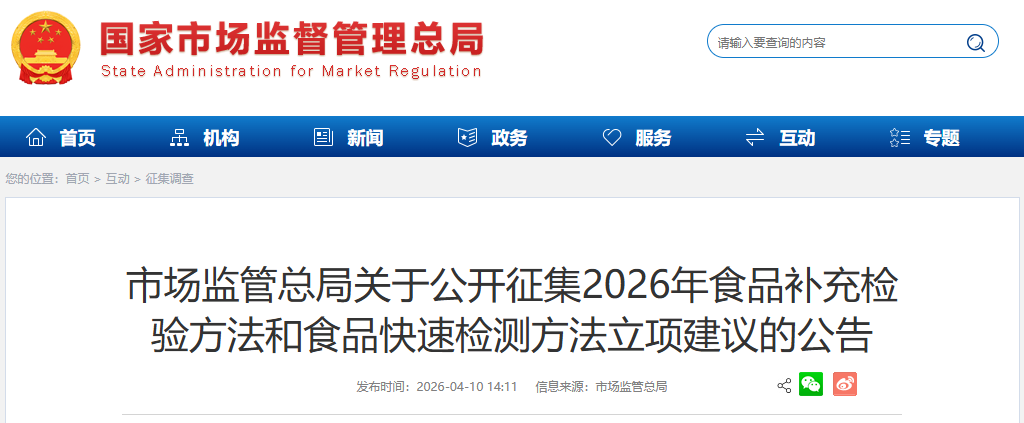 為強(qiáng)化食品安全監(jiān)管技術(shù)支撐,現(xiàn)公開征集2026年食品補(bǔ)充檢驗方法和食品快速檢測方法立項建議,有關(guān)事項和要求如下: