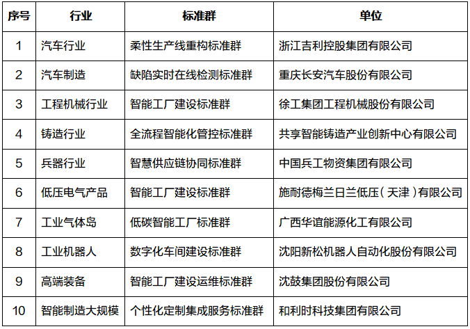 在本次會(huì)議上,發(fā)布了首批“智能制造標(biāo)準(zhǔn)應(yīng)用試點(diǎn)”十大標(biāo)準(zhǔn)群成果。具體如下: