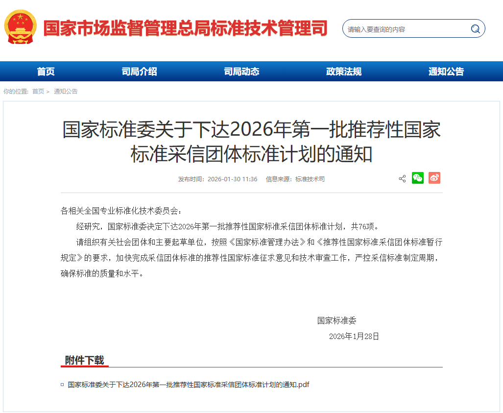 隨著《社會(huì)團(tuán)體登記管理?xiàng)l例》修訂版正式施行,國(guó)家標(biāo)準(zhǔn)化管理委員會(huì)同步下達(dá)《2026年第一批推薦性國(guó)家標(biāo)準(zhǔn)采信團(tuán)體標(biāo)準(zhǔn)計(jì)劃》,76項(xiàng)團(tuán)體標(biāo)準(zhǔn)正式納入推薦性國(guó)家標(biāo)準(zhǔn)計(jì)劃。