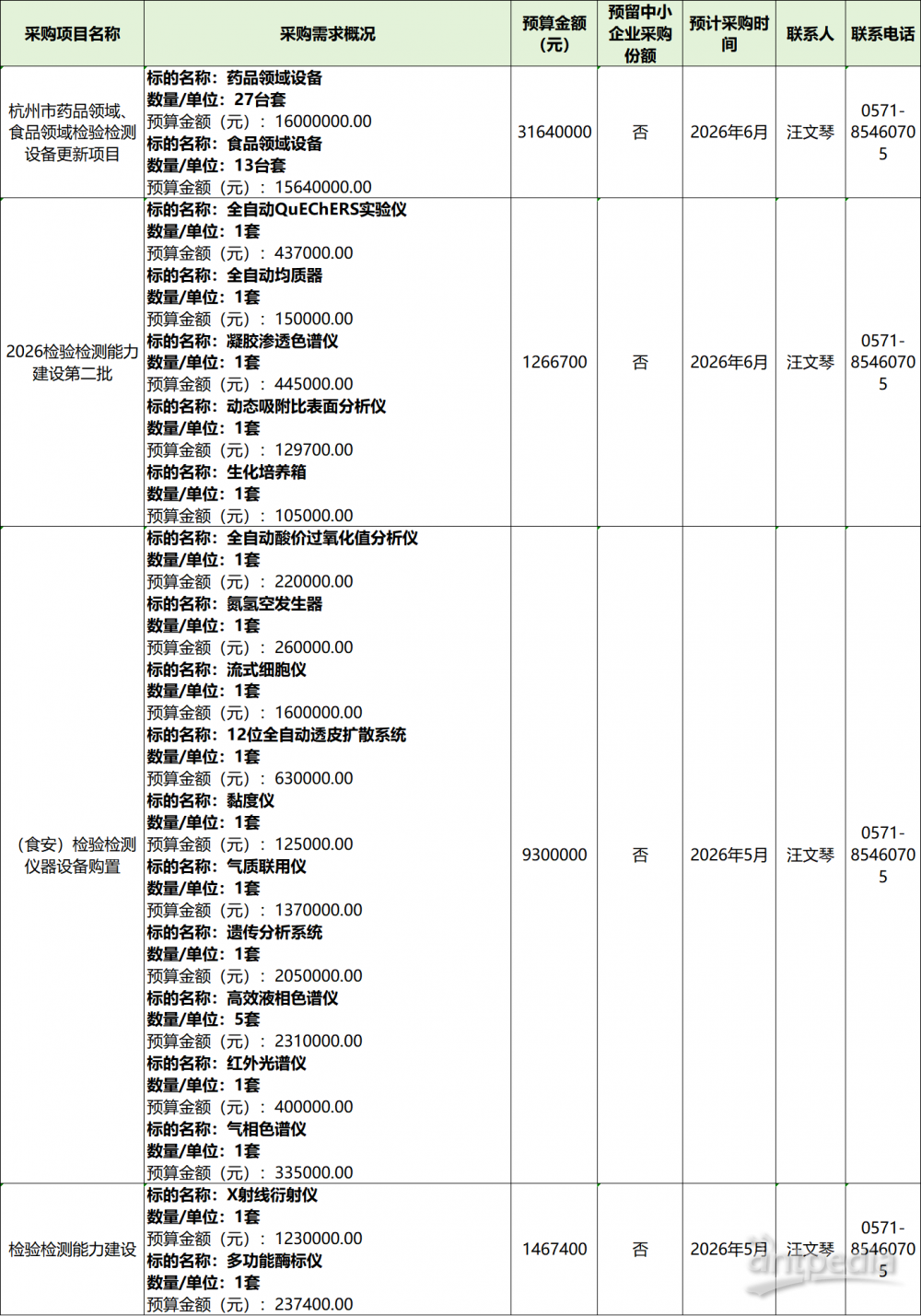 近日,杭州市食品藥品檢驗(yàn)科學(xué)研究院發(fā)布多條20265月至6月政府采購(gòu)意向,計(jì)劃采購(gòu)高效液相色譜儀、X射線衍射儀、氣質(zhì)聯(lián)用儀、遺傳分析系統(tǒng)等61套儀器設(shè)備,預(yù)算總金額為4367.41萬(wàn)元,采購(gòu)預(yù)計(jì)于5月、6月分批進(jìn)行,具體詳見(jiàn)后續(xù)采購(gòu)文件。