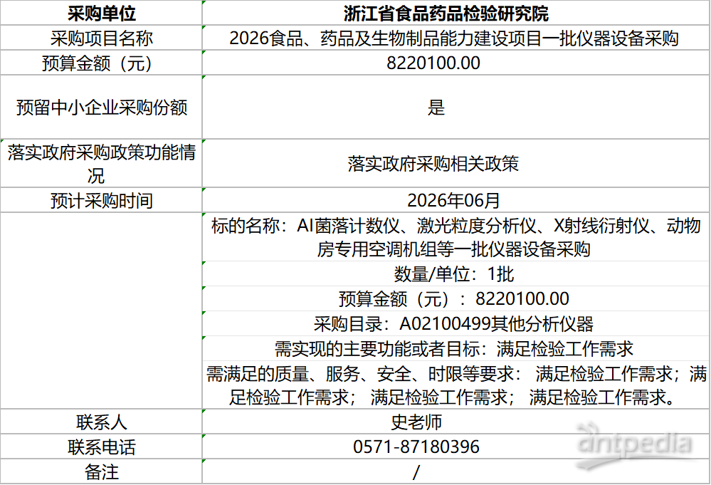 4月23日,浙江食藥檢院發(fā)布2026年6月至12月政府采購意向,擬采購AI菌落計數(shù)儀、激光粒度分析儀、X射線衍射儀、動物房專用空調(diào)機(jī)組等一批儀器設(shè)備,預(yù)算金額為822.01萬元。