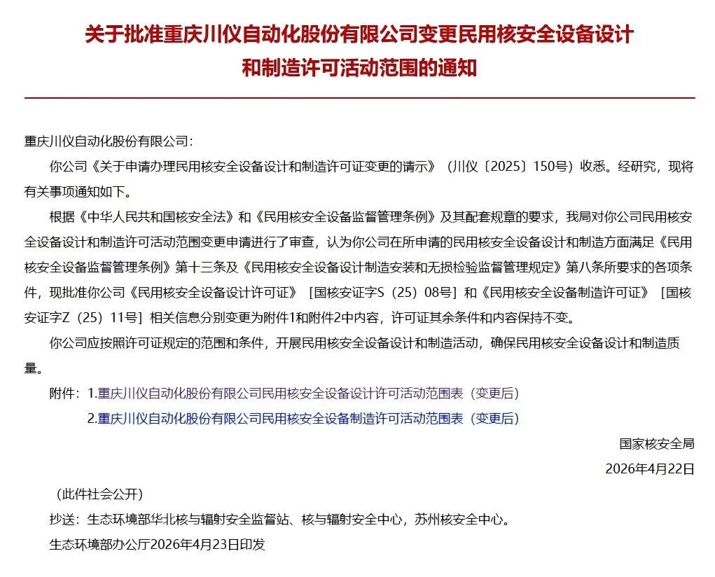 4月23日,國機(jī)儀器儀表集團(tuán)所屬川儀股份通過國家核安全局審批,在已取得過程控制機(jī)柜、開關(guān)型閥門電動裝置、磁浮子式液位計三類1E級民用核安全設(shè)備許可證書的基礎(chǔ)上,成功新增1E級投入式靜壓液位計的設(shè)計和制造資質(zhì)。該資質(zhì)的取得,標(biāo)志著川儀股份在核電關(guān)鍵儀表自主化領(lǐng)域邁上全新臺階。